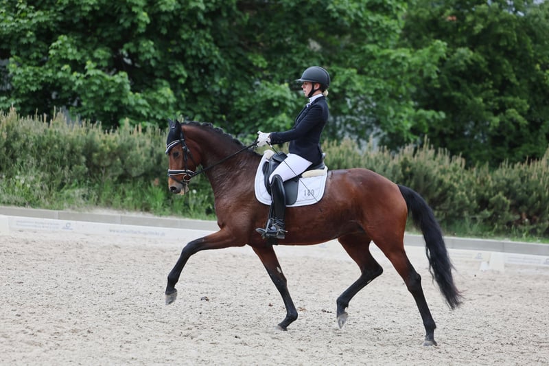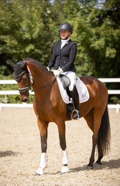 MALOU, eine bildschöne Stute abstammend von Morricone x De Chirico, die mit ihrer Ausstrahlung stets alle Blicke auf sich zieht. Sie ist mit 3 sehr guten Grundgangarten ausgestattet und einer enormen Rittigkeit, ganz fein in der Anlehnung, toll zu sitzen, nicht glotzig und mit dem nötigen Go ausgestattet, was weder zu viel noch zu wenig ist. Ihre bisherigen Turnierstarts meisterte sie souverän und konnte sich mit hohen Noten mehrfach an vorderer Stelle in Dressurpferdeprüfungen der Kl. M platzieren. Gute Ansätze für Piaffe/ Passage runden ihr Talent und die Perspektive für den großen Dressursport ab. Da sie sehr menschenbezogen ist, wünschen wir uns für Malou ein tolles Zuhause, wo sie geliebt und geschätzt wird. Sehr guter TÜV vorhanden.