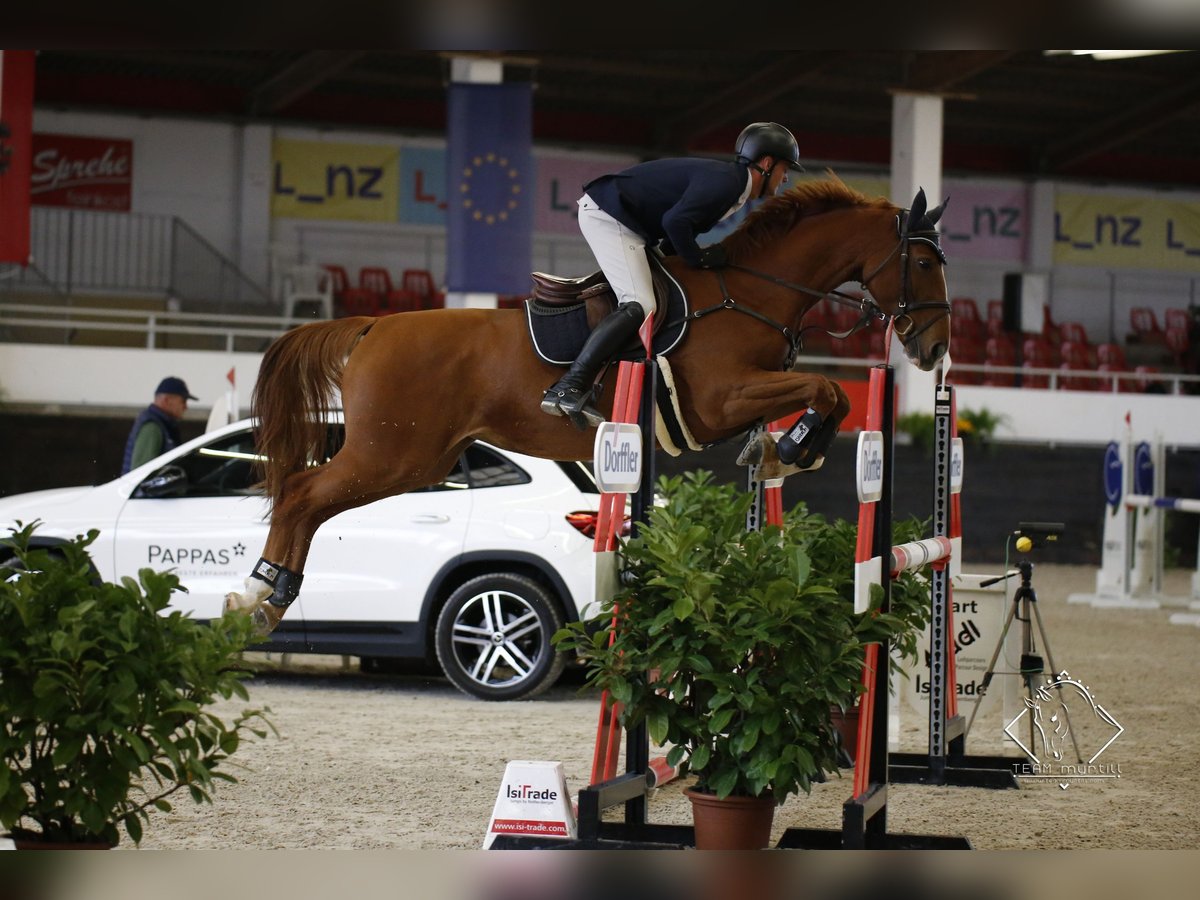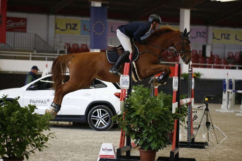 Mare, 9 years old, sired by Manchester van't Paradijs. Excellent balance, wonderful temperament, always well-behaved over fences – no stops! Won Grand Prix at 130 cm. Knows all basics: farrier, veterinarian, dogs, cats. Very well-behaved during rides, loads without issues. Professional in show jumping, competed internationally at 120 to 130 cm. Suitable for amateurs. TÜV very good.