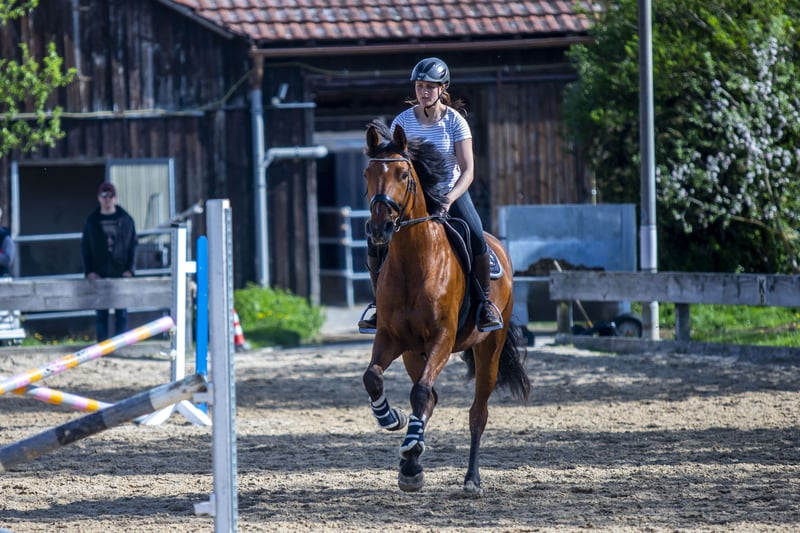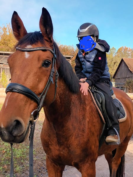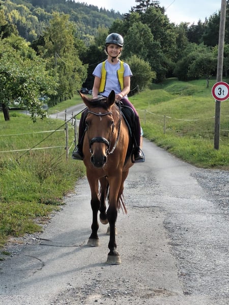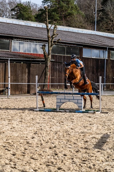 Für meine 9-jährige braune Stute suche ich ein neues Zuhause. Sie wurde von mir in den letzten fünf Jahren schonend und vielseitig ausgebildet. Neben der dressur- und springmäßigen Grundausbildung kennt sie die Grundzüge der Bodenarbeit und ist sehr gerne und unerschrocken sowohl alleine als auch in Gesellschaft im Gelände (Wald) unterwegs. Hier zeigt sie sich zuverlässig und nervenstark und man kann sich stets auf sie verlassen. Sie meistert dort auch unvorhersehbare Situationen (Traktor, Jogger, Waldarbeiter, Begegnungen mit anderen Reitern, ...) souverän. Dressurmäßig wurde sie solide ausgebildet und wünscht sich hier einen Reiter, der sie abwechslungsreich beschäftigt. Beim Springen braucht sie einen ambitionierten Reiter, der ihr von oben die nötige Sicherheit vermitteln kann. Im täglichen Umgang ist sie eine selbstbewusste Stute, die klare Strukturen und eine konsequente und erfahrene Führung braucht. Mit der richtigen Bezugsperson zeigt sie sich jedoch loyal und arbeitswillig. Im Verband mit anderen Pferden ist sie ausgesprochen sozial und verträglich. Sie ist anderen Pferden gegenüber sehr umgänglich und integriert sich problemlos mit diesen. Auf Grund ihres ausgeglichenen Wesens im sozialen Kontakt kann ich sie mir auch sehr gut in einem Offenstall vorstellen. Momentan steht sie in einer Paddockbox. Die Stute ist kein klassisches Anfänger- oder Kinderpferd und wünscht sich in erster Linie einen erfahrenen Reiter, der ihre Qualitäten zu schätzen weiß und Freude daran hat, mit einer (Pferde)Persönlichkeit zu arbeiten. In Kombination mit einer ihr vertrauten und erfahrenen Bezugsperson zeigt sie sich jedoch durchaus gelassen und zuverlässig, so dass sie unter entsprechender Anleitung und Begleitung auch Anfänger oder Kinder auf ihr reiten können. Bei passender Förderung ist sie eine verlässliche Begleiterin für entspannte Ausritte und den ambitionierten, vielseitigen Freizeitbereich – ideal für Reiter, die gemeinsame Erlebnisse höher gewichten, als sportliche Ambitionen.