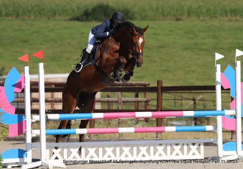 Cavallo gentile e grande, non lasciatevi spaventare dalla sua altezza, questo cavallo di 1,80 m è una palla d'amore molto vicino all'uomo e rispettoso. Non ha mai fatto cadere nessun cavaliere. Si può "dimenticare" per una settimana al pascolo e venire a montarlo, non farà nessun passo falso. Attualmente montato da un'amatrice, è un maestro di scuola e farà sicuramente la felicità di un adolescente. Conosce le basi del dressage: è rotondo nelle tre andature e cambia piede al galoppo. Va in passeggiata senza alcun problema. Cavallo con buone capacità nel salto ostacoli (ha saltato fino a 1,15 m in Germania) ma è riluttante, per questo motivo preferiamo trovargli una famiglia che si dedichi piuttosto al "tempo libero migliorato" e chissà, un giorno, con la persona giusta, potrebbe fare belle performance in concorso. Cavallo che purtroppo è cresciuto troppo in fretta, il che gli vale delle radiografie un po' medie (piccolo navicolare) che sono gestite senza problemi grazie a un'adeguata ferratura e, se necessario, a una terapia con leech. Venduto direttamente dall'allevatore, solo per buona casa.