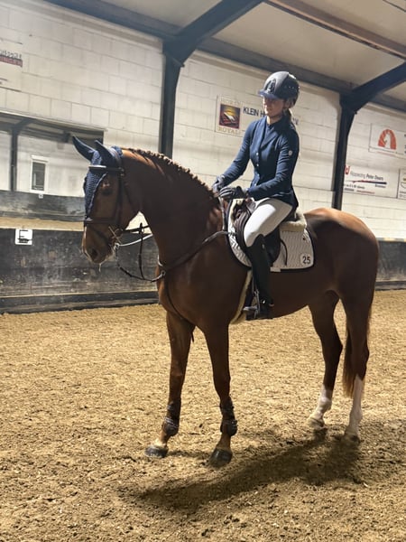 Te koop: Deze super fijne 4-jarige springgefokte merrie van Diamant de Plaisir x Guidam Sohn. Ze is vorig jaar zadelmak gemaakt en is daarna veel mee van huis geweest. Ze is super braaf op vreemd terrein, springt netjes een parcoursje rond en gaat ook graag mee het bos in. Ook aan de hand is ze heel braaf in en om de stal.