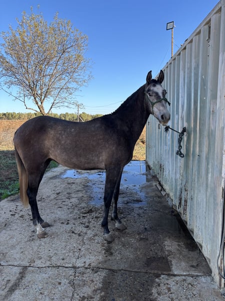 Potro CDE, con 30 meses, noble y dando cuerda con el filete y montura sin ningún tipo de problema. Se deja coger manos y pies. Su padre es un caballo lusitano con hannoveriano siendo este hijo de santano caballo de Javier bolao y su madre una yegua española que viene por tesoro semental de la yeguada militar.