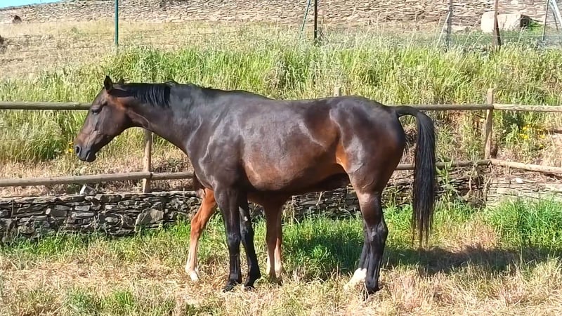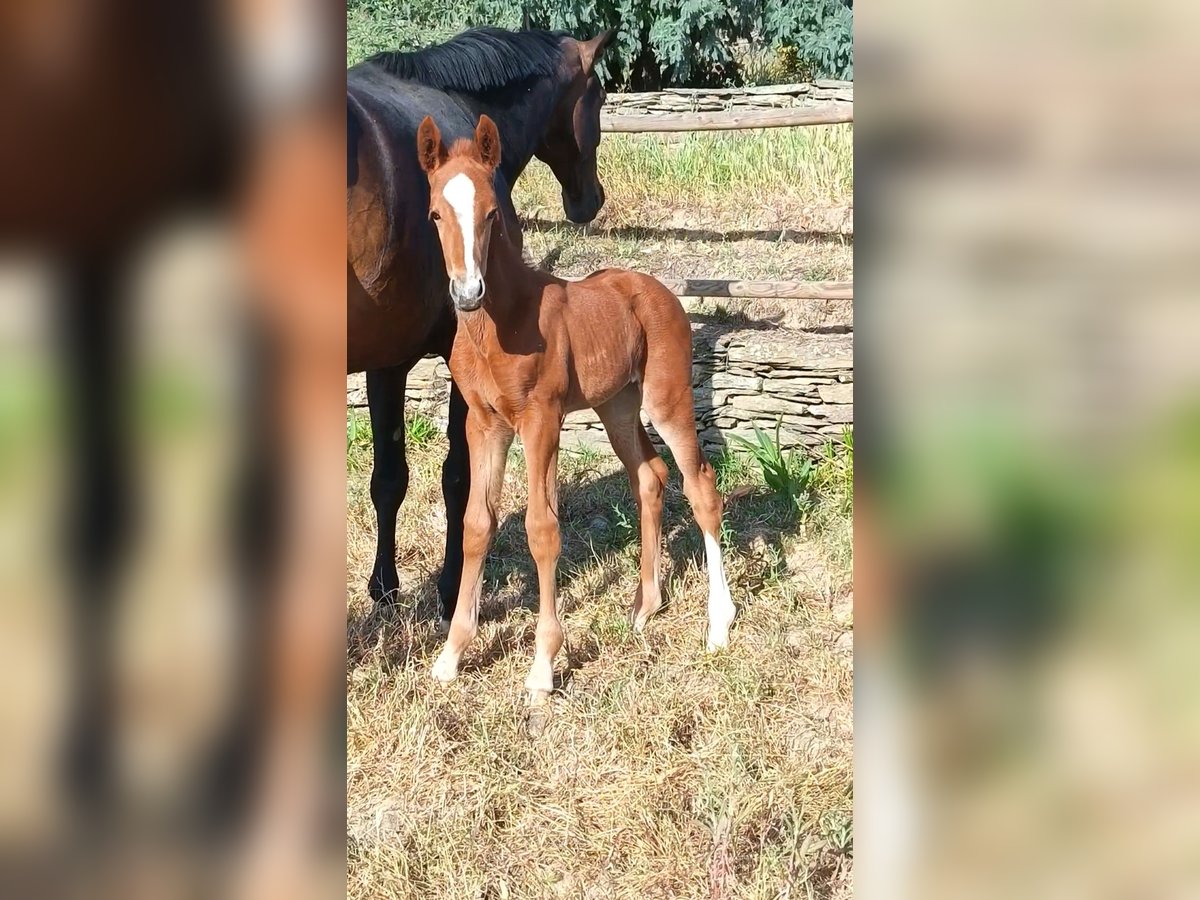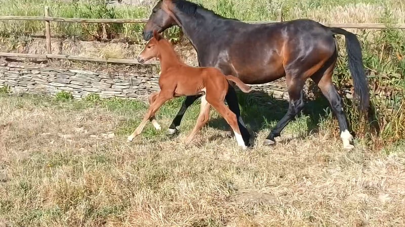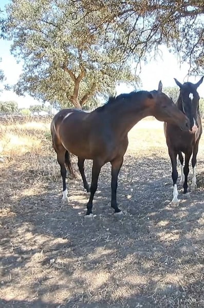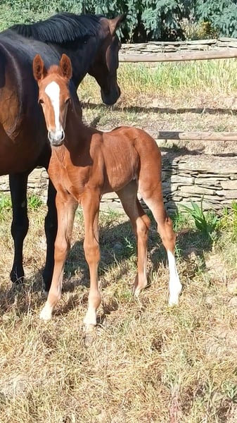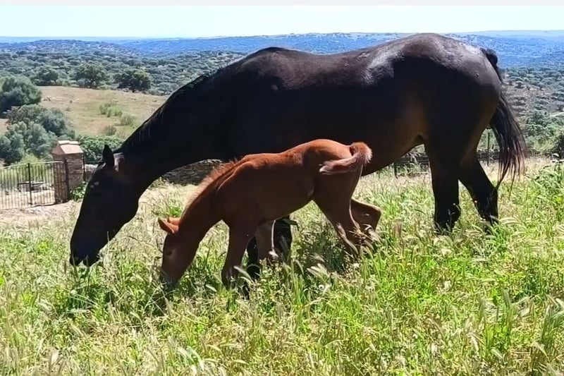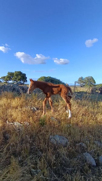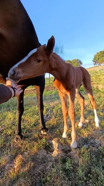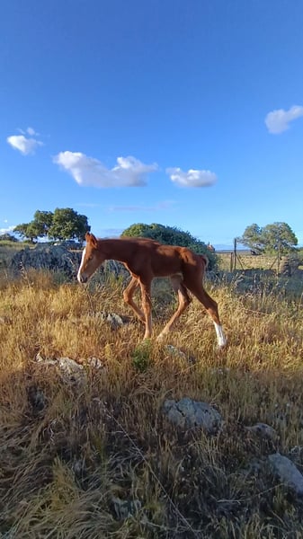 Wunderschöne, leuchtend kastanienfarbene Stutefohlen von Sarabi CS, eine Stute aus der Carrascal-Zucht in Sanchiricones, Tochter von Salinero Punta de Lanza. In ihrer Abstammung finden sich bekannte Vorfahren wie Sancisco oder Donerhall. Die Mutter von Sarabi ist Estoril, eine der herausragenden Carrascal-Stuten, Tochter des importierten Hengsts Espriwall, und sie ist die Halbschwester von El Villar, einem Pferd im Besitz von Alba Abollo, mit dem sie den dritten Platz in Europa belegte. Sarabi verfügt über einen beeindruckenden Schritt, viel Kraft in den Hüften, die Füße treten bei jedem Schritt deutlich unter den Körper, dazu ein schwebender, rhythmischer Trab mit viel Takt und einem freundlichen, aufgeschlossenen Wesen. Viele ihrer positiven Eigenschaften sind serienmäßig vorhanden – das ist kein Zufall, sondern das Ergebnis über 50 Jahre sorgfältiger Zucht und Auswahl bei Carrascal. 🧡🤍🧡 Im Foto zusammen mit ihrer 5 Tage alten Fohlen, Tochter von Peru's Sansaryno (Vivaldi-Linie).