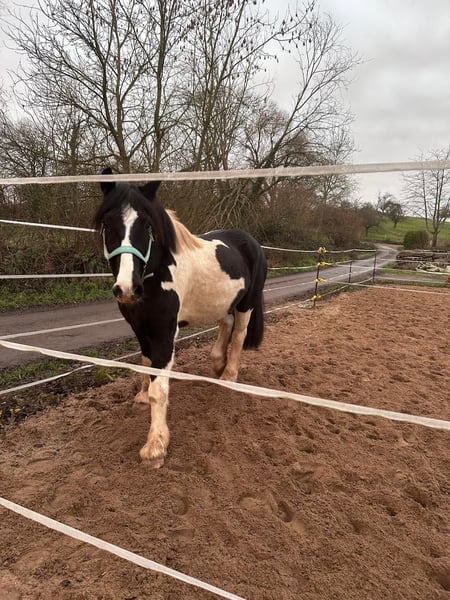 Cailan ist ein achtjähriger lieber, charmanter und sensibler Irish Sporthorse Tinker Mix -Wallach (1,56 m) der Spass und Interesse an der Arbeit hat und der "seinem" Menschen sein grosses Herz öffnet, wenn er das nötige Vertrauen erlangt hat. Cailan sucht neue verantwortungsvolle Besitzer mit Zeit, Geduld und dem nötigen Knowhow um gemeinsam zu wachsen. Er liebt Bodenarbeit, zeigt dabei sehr viel Interesse und reagiert auf feine Hilfen. Er freut sich über jede Aufmerksamkeit und genießt die Zeit und den Umgang mit seinen Menschen. • Jedoch ist Cailan kein Anfängerpferd! Cailan wird als roh abgegeben und braucht eine ruhige, verlässliche Führung die ihm Sicherheit gibt. Im Umgang ist er aufmerksam aber noch unsicher in neuen Situationen und benötigt deswegen durch "seinen" neuen Menschen Geduld und Feingefühl. • Eine konsequente Begleitung durch Bodenarbeit, ganzheitliche Übungen zur Festigung von Vertrauen und Bindung, Langfristig faire, klare Zusammenarbeit auf Basis von Respekt und Sicherheit, machen aus Cailan sicher einen verlässlichen Freizeitpartner. Leider fehlte bisher hierzu die nötige Zeit und auch Knowhow der Vorbesitzer. • Cailan war nie krank, hat gute Hufe, ist schmiede und verladefromm, verträgt 24/7-Weide, kennt auch Offenstallhaltung und Paddockbox. Cailan sucht ein : • 5*-Zuhause mit regelmäßiger Beschäftigung, Fairness und klarer Führung. • Einen geduldigen und erfahrenen Menschen ! Keine Anfragen von Händlern oder Schulbetrieben! Bei Interesse gerne kennenlernen. Absolut Platz vor Preis!