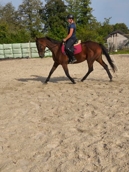 For sale is a 14-year-old Irish Sport Horse. When riding, she is very well-behaved and moves well in all three gaits. With us, she is primarily ridden in the arena and shows herself to be fearless. She can also be ridden with a pad. It doesn't matter if children are playing nearby or if work is taking place. She has also jumped small jumps and performs well, showing enjoyment in it. In handling, she may occasionally test boundaries, meaning she checks if her speed and direction while being led are acceptable (this depends on her daily condition). However, if you consistently tell her that she is not allowed to decide, she accepts it and walks nicely. She is being sold only because she is being bullied in our herd. Preferably in open stable housing. For questions, feel free to contact via WhatsApp at +4917643590497. Price negotiable and a good home is more important than the price.