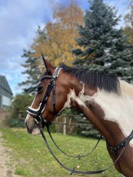 Miss Dakota, a 15-year-old mare, is a gentle, affectionate horse seeking a new, suitable home. She is very people-oriented and reliable in daily handling. In groundwork and lunging, she works attentively and with enthusiasm, always easy to handle. She is also a trustworthy partner in the field, riding calmly and well-behaved in a group setting. Under saddle, Miss Dakota requires a consistent, clear leadership. She is not suitable for children or beginners, as she needs a confident, experienced rider who can give her guidance. With the right person by her side, she can showcase her full potential and brings great joy to riding. She particularly thrives over fences, displaying enthusiasm and talent. Miss Dakota is a loyal, motivated mare with a big heart, looking for a partner who understands and nurtures her. Her saddle is currently being sold, so a trial ride without a saddle is only possible at the moment. She will be sold with various accessories. She is 15 years old and measures 1.57 meters at the withers. This is not a desperate sale; I am looking for a loving home where she will be appreciated and valued. If interested or if you have any questions, please feel free to contact me.