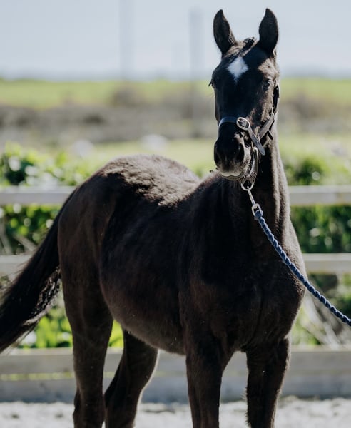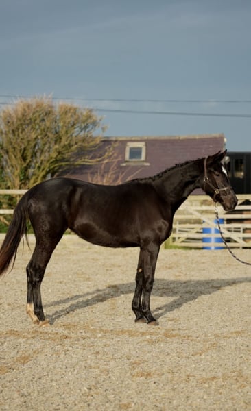Stunning black rising 2yo filly by Lagans OBOS Quality / OBOS Quality x Lougherne Connaught. Expected to mature to approximately 16.2/16.3hh Progeny from both her sire and dam lines are actively competing at the highest international and Olympic levels. Her impressive lineage features: ❕Lougherne Connaught – international 1.60m showjumper ❕Quick Star – 1.70m Olympic showjumper ❕Cavalier Royale – puissance winner and top-❕level showjumper ❕Cassini I – 1.50m national Grand Prix stallion ❕Carrolls Flight – 1.60m international showjumper Dam herself showjumped up to 1.25m before transitioning to eventing. Second dam competed at CSI 1.30m, producing progeny at the same level. Third dam was a CCI4* eventer, with offspring reaching CCI3*. Will be available only to a dedicated showjumping or eventing home. Pepsi is a strikingly elegant filly. She would be a strong candidate for grading as a 3yo. Easy to do in every way with a super temperament.