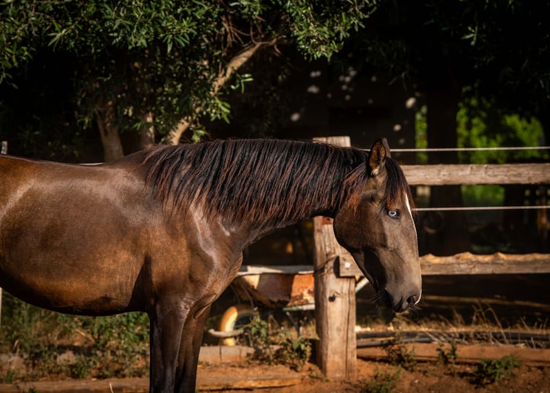 Azula – sporty Portuguese mare with a rare factor Azula is a 2-year-old, sportily built Portuguese mare with an approximate height of 158 cm. She has the delicate, expressive head typical of the Lusitano breed and captivates with her rare dark buckskin color combined with a striking, bright blue eye – a real eye-catcher. In temperament, Azula is open and curious. In her herd of four, she is the confident lead mare – fair, clear in her communication, and always the first at the feed. Whether for sport, as a reliable leisure horse, or for breeding – Azula has the best prerequisites. Upon request, she can also be sold in foal to our grullo stallion (at an additional cost). A young mare with charisma & potential.