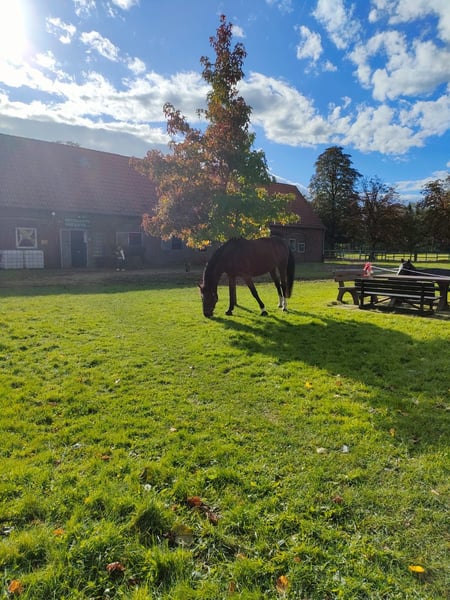 Schweren Herzens müssen wir unseren Bestand verkleinern, da einige unserer Reitbeteiligungen aufgehört haben und wir so nicht allen gerecht werden können. Die Stute „Lubaya“ ist eine charakterstarke Stute ca. 174 cm, die zum Menschen immer lieb ist und gefallen möchte. Leider hatte sie im Sommer wieder einen Schaden an der Sehne, so dass sie für den großen Springsport wahrscheinlich nicht mehr in Frage kommt. Sie hatte vor Jahren schon einen Schaden dort, allerdings war sie die Jahre immer lahmfrei und wurde auf Turnieren bis zur A Dressur vorgestellt. Nach vollständiger Heilung wird sie denke ich dort auch wieder einsetzbar sein. Ausritte mit ihr sind kein Problem, sie wird nie böse, aber testet den Reiter dort gerne mal an, daher keine reine Anfängerstute. Leider fehlen uns die Reiter um sie langsam wieder richtig aufzubauen. Schritt kann sie geritten werden und alles andere muss langsam aufgebaut werden. Da sie eine tolle SLP hat kann ich sie mir gut auch als Zuchtstute vorstellen. Weitere Fragen können gerne geklärt werden.