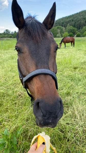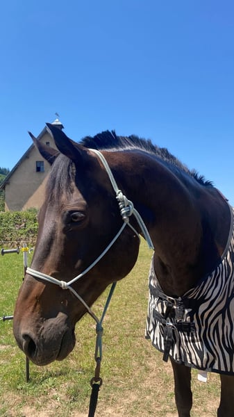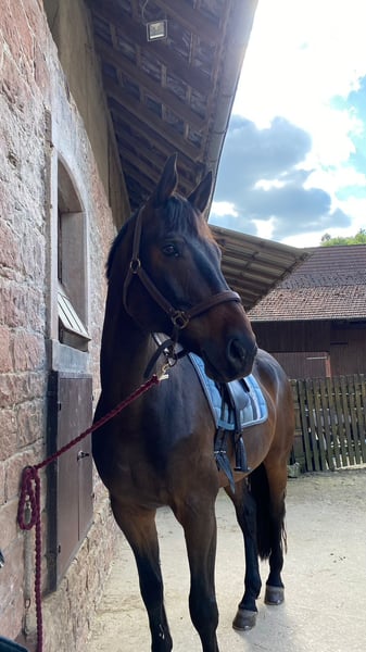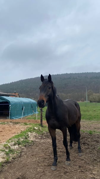 Wir verkaufen unseren Wallach Queck. Queck ist ein 15 jähriger Holsteiner und ca.174 cm gross. Aufgrund einer ausgeheilten Verletzung darf er nicht mehr springen, ist aber seit über einem Jahr wieder dressurmässig mit viel Spass zu reiten, was ihn zu einem super Pferd für ambitionierte Freizeitreiter*innen macht. Er ist sehr fein an der Hand und angenehm zu sitzen, und kennt von der Hilfengebung her auch noch viele Lektionen, die sich mit Training und mehr Kondition wieder erarbeiten lassen. Er läuft super an der Doppellonge, hat viel Spass bei der Bodenarbeit, und geht in Begleitung entspannt ins Gelände. Er ist sehr menschenbezogen und möchte gefordert, beschäftigt und betüddelt werden. Trotzdem ist er alles andere als ein Anfängerpferd. Er kann – je nach Tagesform - sowohl im Umgang als auch unterm Sattel ziemlich schwierig sein. Aus Erfahrung tritt dies bei regelmässiger und ausführlicher Beschäftigung mit ihm weniger auf. Genau dieses „Zeit mit ihm verbringen“ kommt bei uns leider gerade wegen Zeitmangel etwas kurz, weshalb wir ihn auch verkaufen möchten. Auf jeden Fall muss man selbstsicher und geduldig sein, sich nicht an der Nase herum führen lassen und sich auch nicht von seinen Clownereien - weder vom Boden noch im Sattel - beeindrucken lassen. Queck steht im Moment bei uns im Offenstall und das wünschen wir uns auch in Zukunft für ihn, da er so viel ausgeglichener ist. Aber auch eine Paddockbox mit tagsüber Koppelgang könnten wir uns für ihn vorstellen. Queck ist kein Notverkauf, und es gilt für uns definitiv Platz vor Preis. Passender Dressursattel (und evtl weiteres Zubehör) ist inclusive. Zur Beantwortung von Fragen und für mehr Details meldet euch einfach unverbindlich.