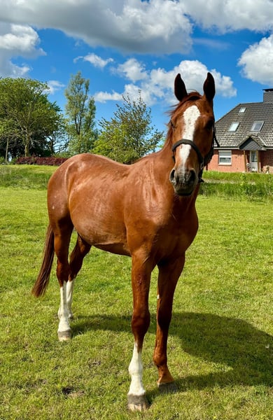 For sale is a 3-year-old gelding from a family-owned breeding. The strikingly marked chestnut has an excellent pedigree. His father Jasper (Heartbreaker x Darco) was highly successful in show jumping at the 5* level. Additionally, his maternal grandfather Diamant de Semilly, with over 200 successful offspring at the 1.60m level and over 300 licensed stallions, is one of the most influential sires of our time. Besides his athletic genetics, the gelding has a balanced and honest character. For further questions, please feel free to call: 0160-96436624.