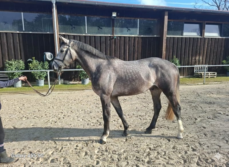 Diamore, known as Didi, is a handsome 3-year-old gray gelding suitable for higher-level sport. He is characterized by his charming demeanor and excellent temperament. Didi has a promising jumping style, is cautious, and very talented. He has recently been backed and continues to demonstrate his wonderful character. He is now looking for a new home where he can be further trained for sport and compete in show jumping events. X-rays are available and are approximately six months old. The gelding stands around 170 cm (16.1 hh) and is in excellent health. For more information, please feel free to contact us by phone.