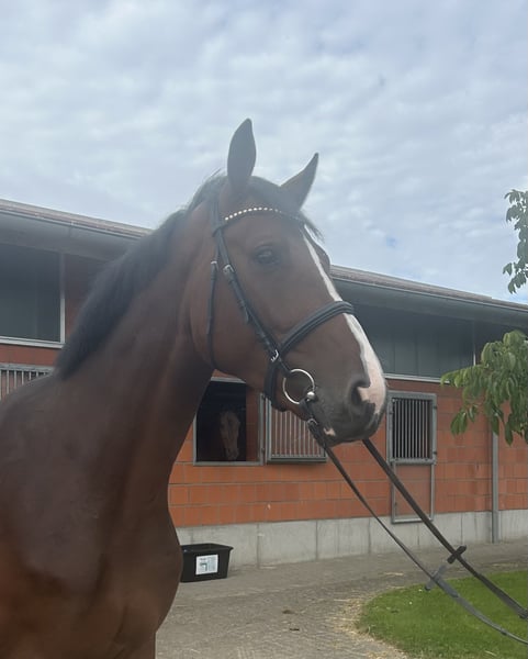 À vendre, un hongre Holsteiner de 4 ans, brave et de grande taille, avec un potentiel d'amitié. Brooklyn est très bien issu de Cornet's Balou (Balou du Reventon) x Uriko x Concerto II. Il est né chez nous et a un demi-frère qui est international à 7 ans au niveau 140 sous la conduite de Bart van der Mart avec succès. Brooklyn possède trois allures de base régulées avec un trot dynamique et un galop ample. Son saut en liberté est prometteur. Le caractère de Brooklyn est particulièrement équilibré, il convient aussi bien pour le saut d'obstacles que pour le dressage, et nous pouvons également l'imaginer comme hunter. Des radiographies peuvent être envoyées sur demande.