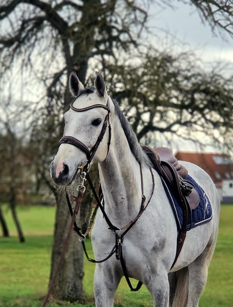 ✨ Ulli, as we lovingly call him, is 168 cm tall and is being sold as a leisure horse. He is healthy, very easy to handle, and possesses three excellent gaits. Due to an injury, he lost his right eye in June 2025, which is why he is being sold at a significantly reduced price. More details are happy to be discussed over the phone. He works wonderfully in the indoor arena, is very soft in the hand, and has comfortable, expressive gaits that are easy to sit. Ulli responds correctly to weight and voice aids. He always wants to do everything right. When jumping, he needs to be shown the obstacles and ground poles first. I usually start the first jumps from a trot, then it’s no problem. I believe he just needs a little time and patience due to his eye loss, then he will become a fantastic jumper. Who knows, maybe I’ll see Ulli and his new owner at a show jumping competition someday. I would definitely be happy 🤠 He is absolutely lovable, cuddly, and completely fearless in handling. Ulli always behaves perfectly, whether with the farrier (barefoot), veterinarian, or when loading – no problem at all. He has such a sweet, endearing personality! In the herd, he is very easygoing and gets along well with everyone. He loves playing with his friends but also gets along with mares. He is a bit reserved around them — I think they are a bit too bossy for him :) Under saddle, he performs like a pro, whether galloping across a meadow or riding through puddles. Ulli enjoys every ride. He is very well-behaved in the terrain, including in traffic. So far, he has only been out in groups or pairs, but I don’t think riding alone would be an issue for him. He is fully dewormed, vaccinated, and his teeth were done last month. Ulli is currently in training with me and is welcome to stay here longer. I am looking for a wonderful new owner who preferably has him in a paddock or turnout all day (also in winter)! Only in the best hands!! A viewing and trial ride are possible at any time. ☎ Please feel free to contact me by phone.