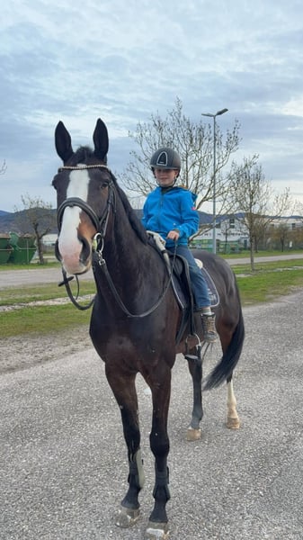 Mio est un hongre de 6 ans, très proche de l’humain et très gentil. Il s’entend bien avec ses congénères et sort en troupeau au paddock. Il est facile à charger, monte seul dans le van ou le camion, et reste calme seul même si le cheval avec lui part. Il possède d’excellentes allures de base, est solidement dressé en dressage, et a déjà sauté jusqu’à 125 cm en saut d’obstacles. Il a obtenu des classements en Épreuves de Saut d’Obstacles pour jeunes chevaux, en L et en L-Springen jusqu’à 115 cm. Malheureusement, Mio a un problème avec l’eau en parcours. Il aurait le potentiel pour le haut niveau, mais sa difficulté avec l’eau le freine, ce qui le met en difficulté. Certains parcours, il sautait parfaitement, d’autres non. À la maison, avec un peu d’entraînement, on peut le convaincre et il saute aussi ces passages. Il est très léger en main, monte seul en terrain varié, et traverse même les flaques d’eau avec plaisir. Il est totalement adorable avec les enfants. Nous le cédons à regret, car nous avons trop de chevaux en ce moment et manquons de temps. Aucun examen vétérinaire approfondi n’a été réalisé, mais il peut être effectué sur demande et à nos frais. Si vous tombez sous le charme de ce joli cheval, doté d’un caractère exceptionnellement doux et aimant, n’hésitez pas à nous contacter pour le connaître.