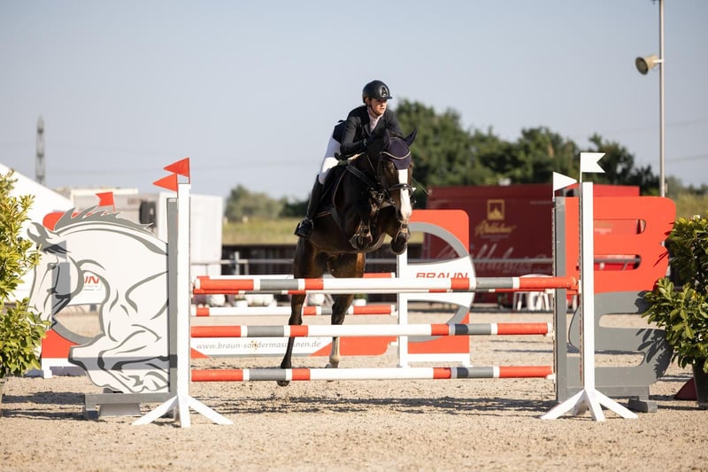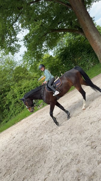 Mio is a 6-year-old, very friendly and affectionate gelding. He gets along well with his herd mates and is turned out in the pasture with them. He is easy to load, walks onto the trailer and truck alone, and remains standing even if the other horse leaves him. He has excellent basic gaits, is solidly trained in dressage, and has competed up to 125 cm in jumping. He has achieved placings in Springpferde A, Springpferde L, and L-level jumping competitions up to 115 cm. Unfortunately, Mio has an issue with water in the arena. He has the talent for higher-level sport, but water remains a challenge for him, which hinders his progress. There have been courses where he jumped flawlessly, and others where he refused. At home, with training, he can be convinced after some time and will jump it. He is very easy to handle, goes alone into the terrain, and even walks through puddles. He is extremely kid-friendly. We are offering him with a heavy heart due to the current number of horses and lack of time. A health check (AKU) has not been performed but can be arranged upon request and at the owner's expense. If you are interested in this charming fellow with his exceptional and loving character, please feel free to get in touch.