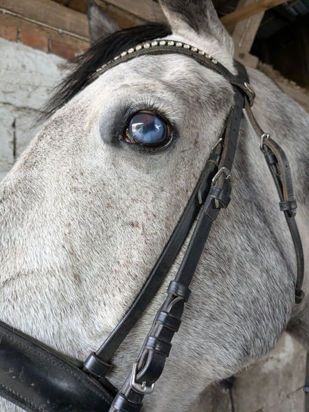 Verkaufen 7 jährigen Schimmelwallach. Beim Reiten und im Umgang ist er absolut artig. Er ist dressurmäßig gut zu reiten, springt einen A Parcours (war 2024 auch schon Gewöhnungsspringen platziert) und geht artig ins Gelände. Alleine ist er dort manchmal etwas ängstlich, aber kein Steigen oder buckeln. Claus steht in einer gemischten Gruppe und ist hier eher rangniedrig. Er hat von Geburt an einen blauen Fleck im Auge, der sich aber nicht vergrößert (siehe Bild ). Seine Sicht nach hinten ist eingeschränkt, nach vorne uneingeschränkt. Hiermit hat er aber keinerlei Probleme.