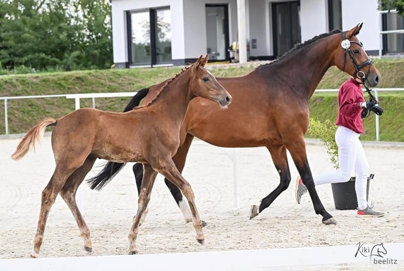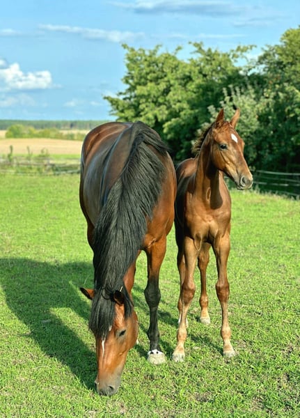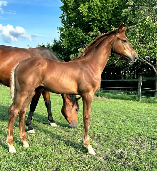 In a sporty and modern presentation, this long-legged and typy colt always appears relaxed with a lot of movement dynamics. Awarded a premium by the breeding association, ZINNOBER placed among the top three colt foals at the foal registration event. Bright, brave, and curious, he also impresses in daily handling with his good character. He is diligently learning the foal ABC and is regularly dewormed and shod. His pedigree also predisposes him, with appropriate support, for a career in (show jumping) sports. Father Zinedream has been successful worldwide with David Will over the highest dimensions. The mother of this foal, descending from the influential stallion Cascadello I, has also been awarded the state premium, along with her mother, and thus belongs to the elite of Holsteiner breeding. The still young mare was able to win her mare performance test (field) in Elmshorn in 2022 with high scores for free jumping and rideability. A full brother to the mother of this foal is currently very successful in the heavy class up to 145 cm and is on the best path to even higher honors. He recently helped his rider achieve 3rd place at the Baden-Württemberg state championships. The pair will thus be able to compete at the German Championships (Amateurs) in Münster. From the Holst. mare line 4025 (including Olympic champion Classic Touch), United Touch is currently making a name for himself on the major competition circuits of the world under Richard Vogel. Secure this offer for a future in ambitious sports. We will be offering this colt to nurturing and experienced hands starting in October. We are happy to assist in finding a suitable place for raising him if needed. Do not hesitate to contact us. A meeting can be arranged at any time by appointment. The description of the foal does not constitute guaranteed characteristics but merely reflects the subjective impressions of the seller at the time of creating the sales advertisement.