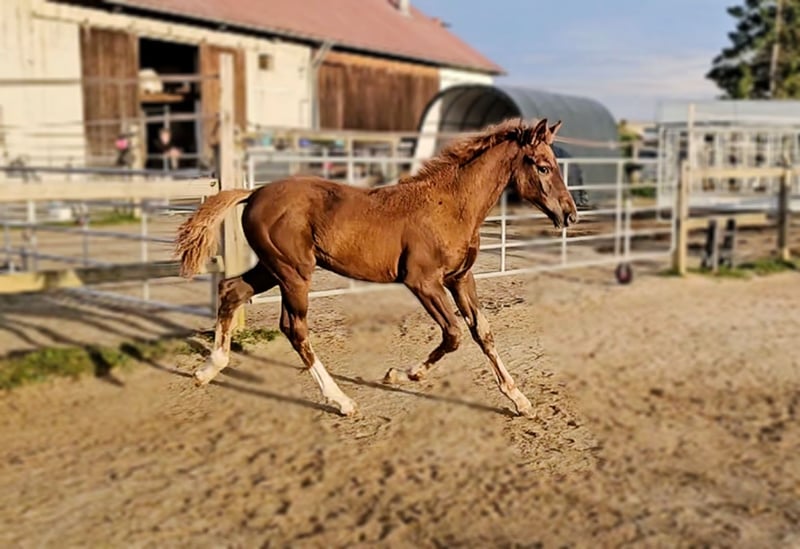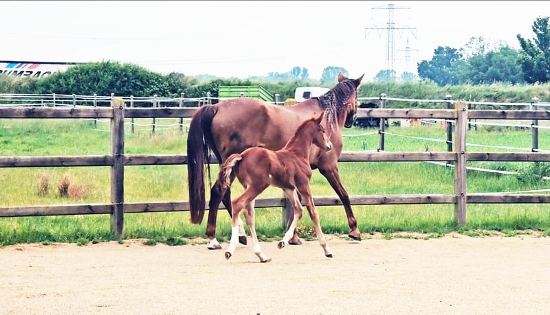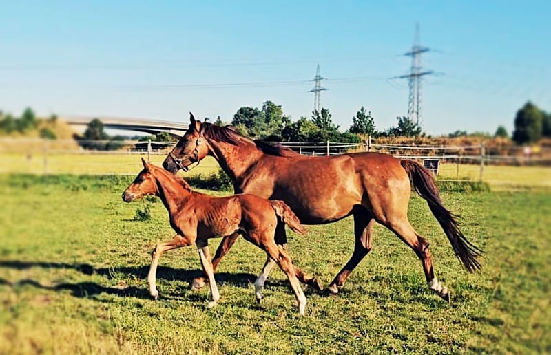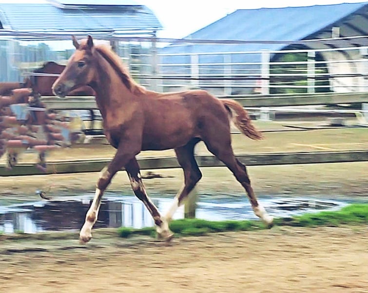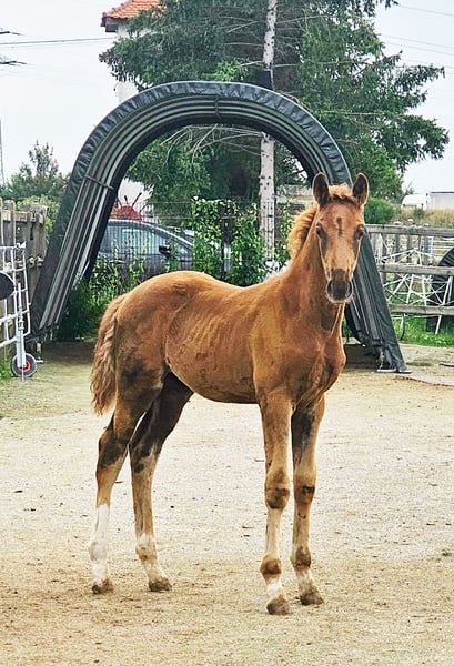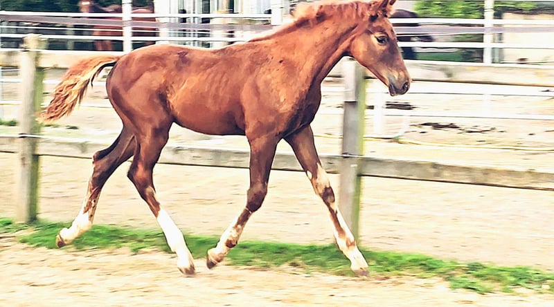 Colt foal born on May 21, 2025 SAN TO ALATI (SECRET) × TOPAS × TOTILAS Not only is the genetics of this foal more than promising, but the sturdy little guy is already proving it. Smooth, harmonious movements full of elasticity and excellent dynamics give a glimpse of his further development. He is growing up in a mixed-age herd and enjoys the advantages of good upbringing from the start, as well as close contact with humans. Very curious, open-minded, and brave, he explores the big wide world. Absolutely clear-headed and fearless, he is making his first connections with other horses. He has an incredible amount of fun moving around and discovering himself and his abilities. His father, San To Alati, was initially the reserve champion at the 14-day test in Adelheidsdorf 2021 and the winner of the sport test in Münster Handorf 2022 with a score of 9.12. In 2022, he became the Hanoverian Champion with a score of 9.12. He reached the grand final of the World Championship for young horses in 2023 and 2024 and was victorious in dressage horse tests up to class M. San To Alati's father is none other than Secret. His offspring are already making history today: countless licensed stallions, state and federal champions, as well as internationally successful young horses testify to his breeding power. The riding qualities of his daughters and sons set new standards and dominate the elite of the competition scene. The secret to his success lies in his outstanding lineage. Through his father Sezuan, the celebrated triple world champion of young dressage horses, Secret carries the best bloodlines. The combination with proven sires Rotspon, Argentan, Woermann, and Lugano in the further generations of his pedigree makes Secret a complete package. We wish for this sporty, modern, beautiful boy the absolute best home with family connection and later sporting support.