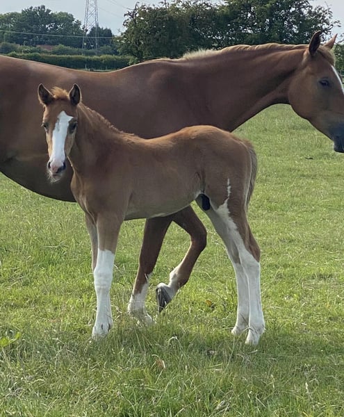 16h/16'1 - 9 jährige Holsteiner Zuchtstute und ihr Hengstfohlen zu verkaufen Mummy hat Balou du rouet und Silvio Blutlinien. Sie produziert hübsche Fohlen mit viel weißem Chrom Bilder 2 und 3 zeigen frühere Fohlen von ihr. Sie ist leicht tragend, sowohl mit gekühltem als auch mit gefrorenem Sperma. Eine große Bereicherung für jeden Züchter. Sie hat eine blonde Mähne und Schweif und produziert auffällige Nachkommen. Sie ist gut zu verladen und zu handhaben. Sie hatte als junges Pferd einen Knieschlag und wurde deshalb als Zuchtstute eingesetzt, aber sie ist gesund auf der Koppel und hat keine negativen Auswirkungen. Sie ist eine liebenswürdige Stute, die gutmütig ist und gut zu handhaben. Sie ist auch bereit, wieder zu fohlen. Ihr Fohlen bei Fuß ist auch ein korrektes und hübsches Modell. Nur zu verkaufen, da ich mich in der Zucht verkleinere. Dies ist ein großer Wert für das Paar, da ihr vorheriges Fohlen für £6,500 verkauft wurde.