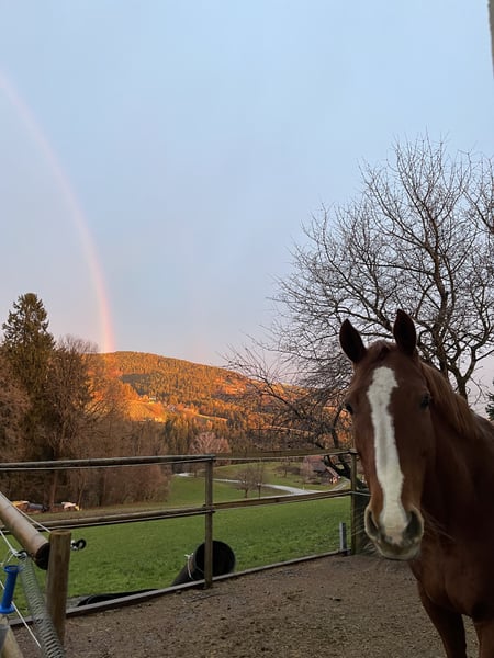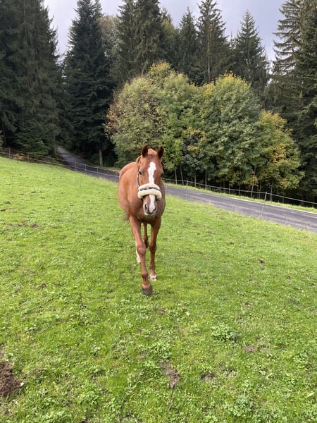 This stylish mare by Uriko x Caretino x Rebel Z is searching for her 100% soulmate. I personally trained her from the age of four, and she has competed up to 1.20 meters in show jumping. She is capable of performing all elementary dressage movements. Due to her strong ambition, she often appears tense and stressed during work in the arena. Her greatest passion is the outdoors. She loves hacking out and is very reliable in the field. She crosses any water, goes over bridges, and is familiar with all kinds of construction machinery, trucks, and agricultural equipment, always remaining calm and composed. She is easy to load alone, stands patiently at the blacksmith (currently being shod with hot shoes), and is accustomed to stable life. She has almost always been turned out full-time on pasture since she was a foal. She previously had a beautiful foal by Keaton, making her also interesting for breeding purposes. She is registered as a broodmare in Austria. Currently, she is ridden by a 12-year-old girl during riding lessons, where she tries her best but can sometimes become a bit wild. "Abby" lives with me on the farm. Unfortunately, we are two very different characters and just can't seem to connect. She deserves a person who appreciates her quite independent nature. It is ONLY the right environment and the right person that matter, not the price.