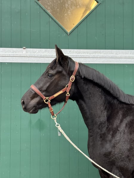 We are currently looking for a new home for our mare "Mooni." She was born at our stable in 2022 and, after weaning, enjoyed excellent upbringing on pasture in a herd of mixed ages. Throughout this time, she has proven to be consistently social and well-behaved. She is familiar with lunging and tacking, and has had initial exposure to rider weight. We are seeking an experienced new owner who will continue her training. Current X-rays can be provided upon request, as well as videos showing "Mooni" in motion. For further questions, please feel free to contact the phone number listed below. (The last two pictures show the mare as a foal and also the reason behind her name. Her distinctive mark still looks exactly the same today.)