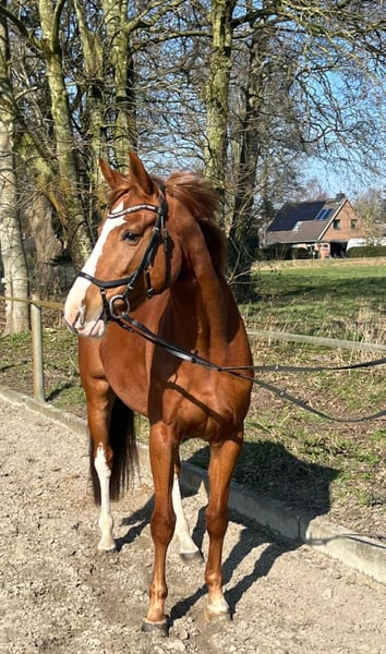 5-year-old chestnut mare. The mare was backed last summer. Afterwards, our daughter took over her care. Unfortunately, they haven't quite found their rhythm together. The mare needs an experienced rider who can support and further her training. She moves well in all three gaits in the indoor arena and on the outdoor sand arena, and is minimally distracted by external influences. She has some initial experience on small hacks and leaves the yard alone without any issues. In traffic, she behaves appropriately. Farrier/loading area: Regularly vaccinated and dewormed. Her teeth are checked regularly. Additional pictures/videos can be provided upon request.