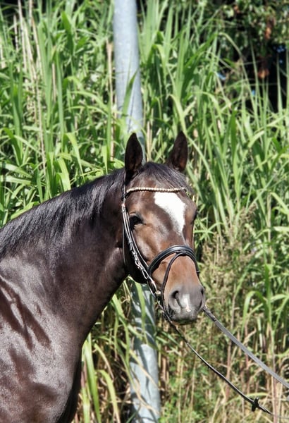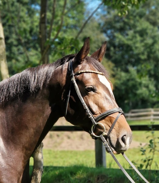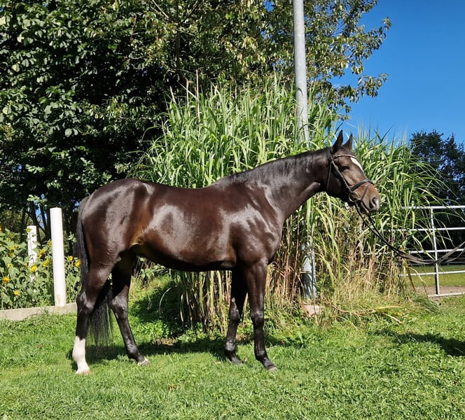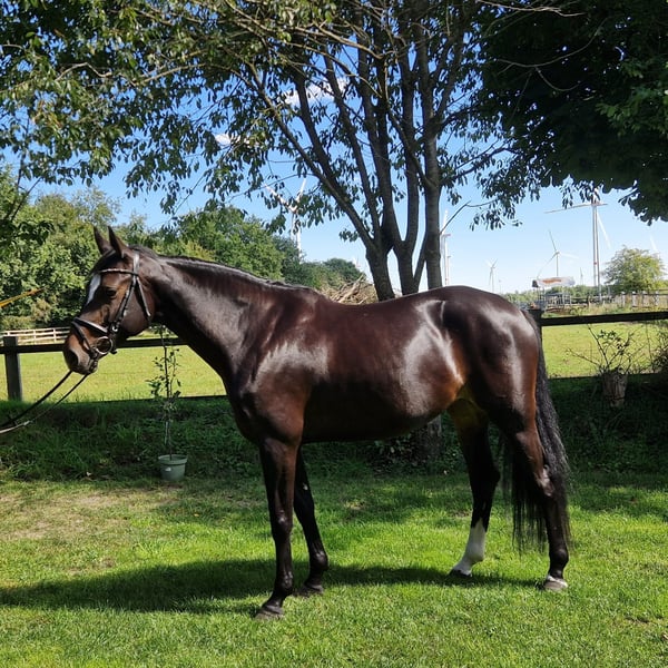 Nuli is a pretty uncomplicated mare that jumps very well. We bought Nuli as a foal from a breeder who is a very good friend of ours. She was backed as a three-year-old and then turned out to pasture again until this spring (even in winter). Thus, she has grown up in a very species-appropriate and age-appropriate manner and is super socialized. She has been back in work for about 4 months now and is in professional training. She shows herself to be very kind and willing in daily work, and especially enjoys jumping. In three starts in show jumping competitions, she was able to place twice right away. She is unflappable at competitions and can be loaded without any problems, etc. Her mother was successful in show jumping up to S level with an amateur and was characterized by an excellent character. If you have any questions, please feel free to call!