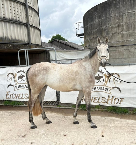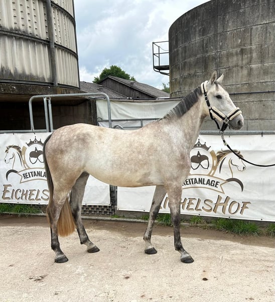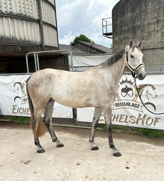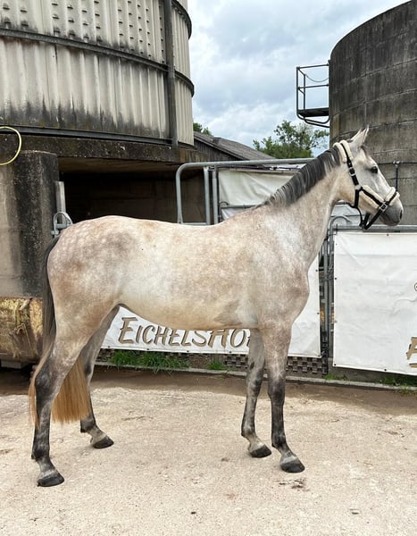 Clara is a stylish 4-year-old gray mare by Clarimo. She is an absolutely well-behaved and clear-headed horse that wants to do everything right when ridden. She is currently being gently started under saddle. Clara is hardworking and has a very positive attitude towards work. We have not yet done any jumps under the rider. She is barefoot, knows pasture, and is used to being kept in a herd. She has a slight overbite, which does not affect her while riding or eating.