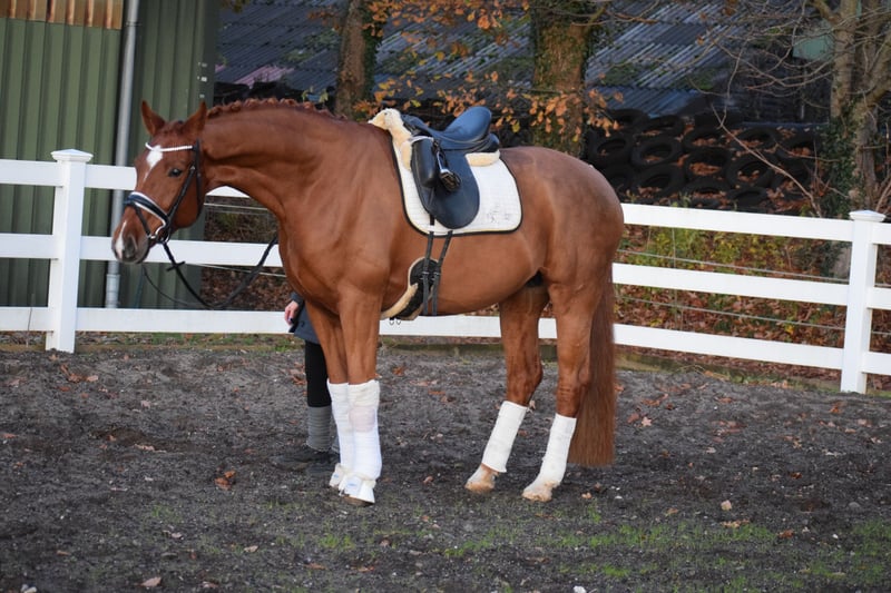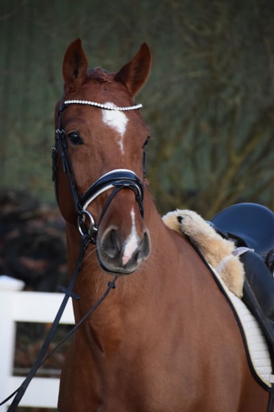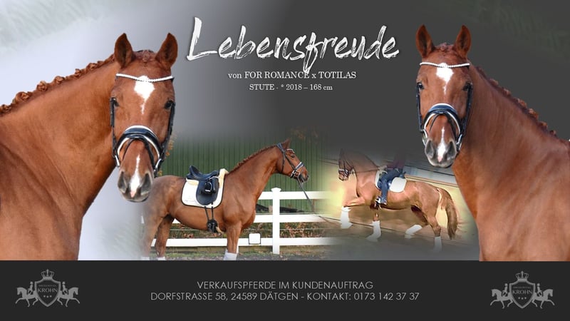 L TURNIERERFOLGREICHE, BILDSCHÖNE UND LEICHTRITTIGE DRESSURSTUTE, MIT VIEL TYP UND GANG & DEM HERZ AM RECHTEN FLECK - TOTILAS BLUT - Junioren geeignet! Zum Verkauf steht in Vertretung des Besitzers diese DRESSURPFERDE A & L erfolgreiche, 168cm 7 j., bunte holsteiner DRESSUR Fuchsstute (hinten 2 x weiß + Stern + Schnippe), mit bester Dressur der TYP und GRAND PRIX macher FOR ROMANCE & TOTILAS. "LEBENSFREUDE" hält was Ihr Name verspricht. Mit diesem Pferd, kann man sein Leben jeden Tag freudvoll bereichern. OPTISCH ist Sie mit Ihrem typvolen Gesicht & harmonischen Gebäude mit auffällig bunter Fuchs zeichung ein echter Hingucker. In BEWEGUNG zeigt sich eine rittige, elastische Dressurstute mit drei gleichwertig guten Grundgangarten, bei schwingendem Rücken, Bergauftendenz, ansprechendem Seitenbild und einem gut gewinkelten, abdruckstarken Hinterbein mit hoher Bereitschaft zur Lastaufnahme. Auf TURNIER konnte "LEBENSFREUDE" bereits Erfahrungen und Platzierungen Sammeln. Auf ihr Konto gehen unter anderem ein A** Dressur - SIEG (7,0), sowie Dressurpferde A - 4. Platz (7,4), Dressurreiter L* - 4. Platz (7,4). Auch in der ZUCHT konnte Lebensfreude nach Ihrer erfolgreich abgelegten Stutenleistungsprüfung - Reiten mit Bezirksprämie (2021), zwei herrausragende Revolution Fohlen hervor bringen. Somit wäre Sie später einmal auch als Zuchtstute wieder in Einsatz zu bringen. Auch die charakterlich Entwicklung einer Stute die bereits fohlen hatte, ist hier positiv zu betonen. Seid her befindet sich "LEBENSFREUDE" in Professionellem Beritt und auf L Niveau. Über Winter kann nun an Lektionen der Klasse M gearbeitet werden. Sie ist aber auch für jeden anderen Spaß zu haben, ob ein Sprung, ein Ausritt oder ein Ringreitwettbewerb, sie macht gerne mit. Wer also ein Pferd mit großer Perspektive, aber auch eine richtige LEBENSFREUDE sucht und dem Herz am rechten Fleck, der hat hier sein Pferd gefunden. Durch ihre hohe Kooperationsbereitschaft, Rittikeit und ihrem absolut ehrlichen Charakter ist sie auch Junioren / Junge Reiter geeignet. Eine echte gelegenheit ein tolles Pferd zu erwerben. Gerne kann "LEBENSFREUDE" nach dem Kauf auch bei uns im professionellen Beritt verbleiben und auch auf Turnier vorgestellt werden. Ein umfangreicher röntgenologischer (Standart + Rücken + Hals), sporttauglicher TÜV liegt vor.