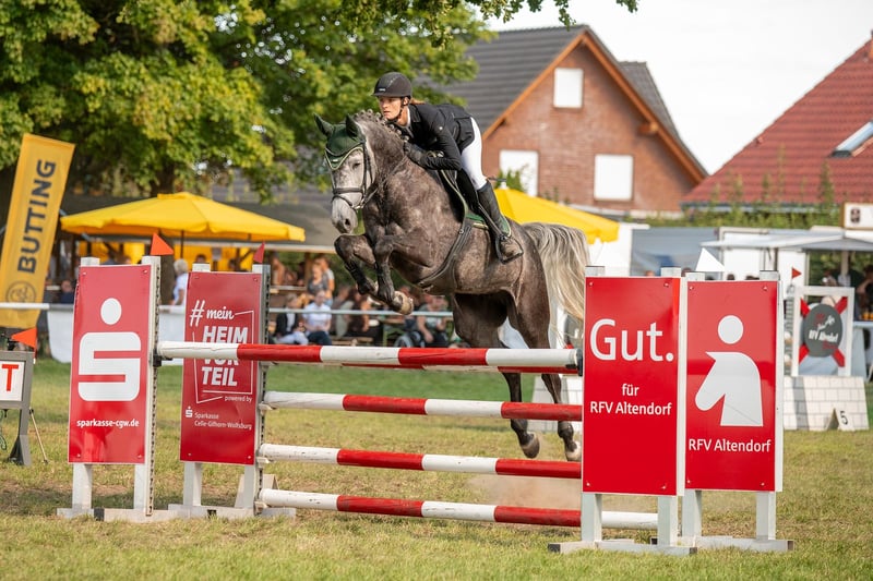 Bildschöne blutgeprägte Holsteiner Schimmelstute von Catoo x Hunter x Calido zu verkaufen. Sie ist 7 Jahre alt und ca. 169cm groß. California verfügt über drei gute Grundgangarten und weiß im Parcours zu überzeugen. Sie ist mit viel Vorsicht, Vermögen und bester Einstellung ausgestattet, ein Pferd was immer auf die andere Seite möchte. Sie ist leicht zu reiten und verfügt über genügend Go nach vorne, ab und an mal etwas stutig, dabei aber nie böse und immer leicht zu händeln. California wurde spät angeritten und ist erst 6 jährig in den Sport gekommen, daher absolut unverbraucht und bereit weiter gefördert zu werden. Sie hat Stilspringen Kl. L (110cm) gewonnen und ist bis Springpferdeprüfung Kl. L hoch platziert. Außerdem konnte sie erste Erfahrung in Springpferdeprüfung Kl. M (120cm) sammeln und bereits fehlerfrei absolvieren. Im Umgang ist sie absolut unkompliziert und auch mit anderen Pferden ist sie sehr verträglich. California stammt aus einem guten Mutterstamm und hat bereits eine Vollschwester die über 145cm Springen erfolgreich ist. Tolles Damen und Juniorenpferd. Gute Röntgenbilder liegen vor. Videos und weitere Infos gerne telefonisch unter 01752555635
