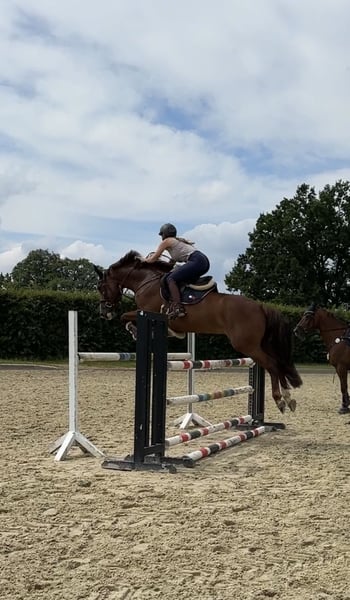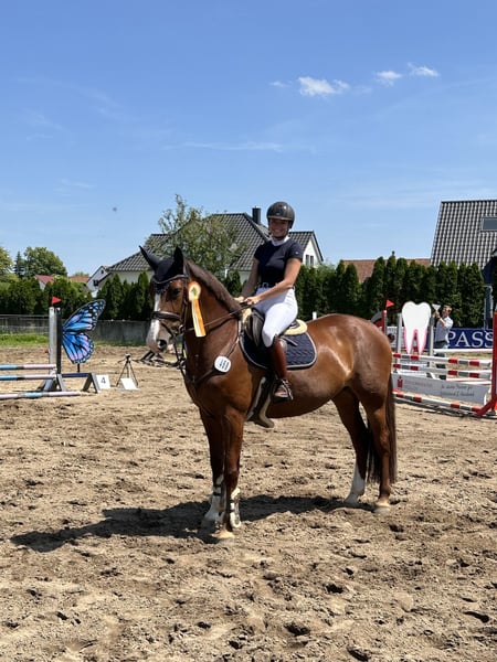 Our charming Karla is looking for a new, loving home. She impresses not only with her wonderful temperament but also with her versatile talent and genuine willingness to perform. Karla is an absolute reliable partner, always well-behaved, mentally alert, forgiving of rider mistakes, and easy to ride. She is also well-behaved in the outdoor, enjoys cross-country jumping, and has never bucked or shown other bad habits. Karla is suitable for children and has already been ridden by young riders. She is confident and calm in traffic as well. A true all-rounder with a heart, ideal as a junior horse or a step-up horse for riders seeking a dependable and honest partner. In 2021, she had a foal. Karla is healthy; in 2024, she suffered a splint bone fracture that was surgically removed and has fully healed. She already competed successfully in 2025 and is ready to bring happiness to her new owner. Show jumping: successful at A* level, placed at A** level, and victorious in style jumping A*. Dressage: successful at A level, placed at L level. Additional equipment can be purchased separately. Teeth recently floated, regularly vaccinated and dewormed.