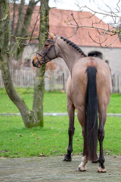 C’est La Vie is een zeer aansprekende Holsteinse merrie. Het vaderschap is van Del Arko d’Henvet, gecombineerd met een moederlijn van Cancara x Alasca. Als jong paard is C’est La Vie zadelmak gemaakt. Vervolgens heeft zij bij ons een veulen gekregen, waarna we haar alle tijd hebben gegeven om in het weiland verder uit te groeien. Anderhalf jaar geleden hebben we haar weer opgepakt en rustig, met oog voor haar ontwikkeling, verder opgeleid. Wij bieden met C’est La Vie een zeer lieve, aanhankelijke en goed werkbare merrie aan, met daarbij ook nog eens prachtige uitstraling Ze heeft twee kleine opmerkingen op de RX, die haar klinisch niet belemmeren, en daarom hebben wij besloten haar gewoon zo aan te bieden. Kortom, een interessant paard dat klaar is voor de volgende stap in haar sportieve carrière. C’est La Vie is a very appealing Holstein mare. She is by Del Arko d’Henvet, combined with a dam line of Cancara x Alasca. As a young horse, C’est La Vie was made saddle-broke. She then had a foal with us, after which we gave her plenty of time to grow and mature in the pasture. About a year and a half ago, we brought her back into training and continued her education calmly, paying close attention to her development. With C’est La Vie, we offer a very kind, affectionate, and easy-to-handle mare, who also has a beautiful presence. She has two minor points on her X-rays, which do not affect her clinically, and for that reason, we have chosen to offer her just as she is. In short, an interesting horse that is ready for the next step in her sporting career. C’est La Vie est une jument Holstein très séduisante. Elle est issue de Del Arko d’Henvet, combiné à une lignée maternelle Cancara x Alasca. Jeune, C’est La Vie a été mise au travail avec la selle. Elle a ensuite eu un poulain chez nous, après quoi nous lui avons laissé tout le temps nécessaire pour se développer tranquillement dans le pâturage. Il y a environ un an et demi, nous l’avons reprise et l’avons formée calmement, en respectant pleinement son développement. Avec C’est La Vie, nous proposons une jument très douce, affectueuse et facile à travailler, avec en plus une belle prestance. Elle présente deux petites observations sur les radiographies, qui ne la gênent pas cliniquement ; c’est pourquoi nous avons choisi de la proposer telle quelle. En résumé, un cheval intéressant, prêt à franchir la prochaine étape de sa carrière sportive. C’est La Vie ist eine sehr ansprechende Holsteiner Stute. Sie ist von Del Arko d’Henvet abstammend, kombiniert mit einer Mutterlinie von Cancara x Alasca. Als junges Pferd wurde C’est La Vie an den Sattel gewöhnt. Anschließend hat sie bei uns ein Fohlen bekommen, danach haben wir ihr alle Zeit gegeben, sich in der Weide weiter zu entwickeln. Vor etwa anderthalb Jahren haben wir sie wieder aufgenommen und ruhig, mit Augenmerk auf ihre Entwicklung, weiter ausgebildet. Mit C’est La Vie bieten wir eine sehr liebe, anhängliche und gut handhabbare Stute an, die zudem über eine wunderschöne Ausstrahlung verfügt. Sie hat zwei kleine Auffälligkeiten auf den Röntgenbildern, die sie klinisch nicht beeinträchtigen, weshalb wir uns entschieden haben, sie genauso anzubieten. Kurz gesagt: ein interessantes Pferd, das bereit ist für den nächsten Schritt in ihrer sportlichen Karriere.