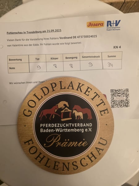 Wir suchen ein neues Zuhause für unser wunderschönes Schwarzwälder Kaltblut Hengstfohlen. Verdinand aus der Edda von Valentino ist im April 2025 bei uns geboren und wächst im Herdenverband auf. Er kennt die Weidehaltung und die Gruppenbox. Er ist neugierig und aufgeschlossen, wodurch auch das erste mal Anhänger fahren keine Probleme verursachte. Er kennt große landwirtschaftliche Maschinen und das Fohlen ABC. Bei der Fohlenschau wurde er mit 34 Punkten als Goldfohlen bewertet. Er ist mittlerweile von seiner Mutter abgesetzt und lebt mit Wallachen, einem 2 jährigen Hengst und einem gleichaltrigen Jährling in Gruppenhaltung. Es können gerne Termine zur Besichtigung vereinbart werden.