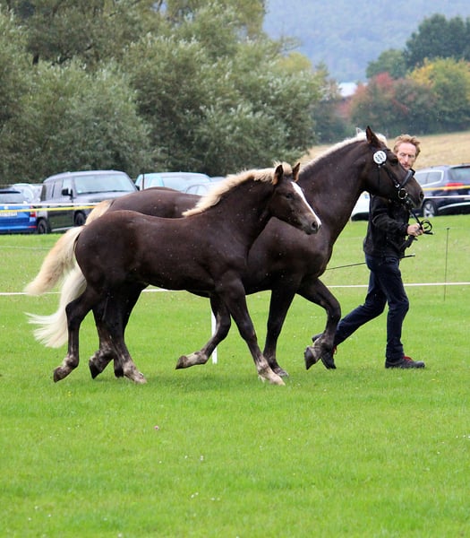 We are looking for a new home for our beautiful Schwarzwälder cold-blood colt. Vridolin, out of Feine Marie by Vento, was born in May and is growing up with us in a herd environment. He is curious and open-minded, which made his first experience with trailer loading trouble-free. He is familiar with large agricultural machinery and the basics of foal handling. At the foal show, he was rated as a Gold Foal with 35 points and was the overall champion foal of the show. He can be handed over starting around December. Appointments for viewing can be arranged.