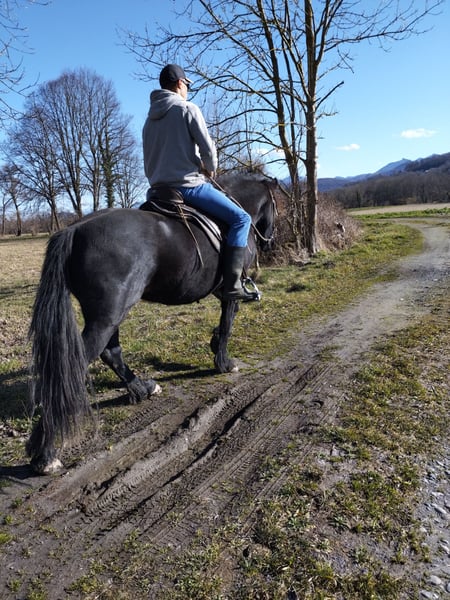 Jument pleine de promesses qui progresse rapidement en carrière comme en exterieur. Belle encolure et belles allures dont un pas franc en balade. Debourrée dans la confiance. Apprentissage de l'équilibre, du respect mutuel et de la légèreté. Equilibre spontané intéressant, bonne montée de garrot et bonne impulsion. Autonome en exterieur, pied sûr, à l'aise dans l'environnement J'inclus un accompagnement professionnel pour assurer la transmission des codes et/ou apporter la formation suffisante au nouveau propriétaire. Elle a grandi en montagne en troupeau. A jour des soins courants, dentiste, ostéo, parage, vermifuge. Pieds nus