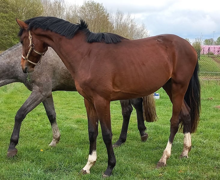 This stunning, registered OS gelding was born in 2023 and comes directly from the breeder. He is being sold solely due to personal circumstances. He has a lot of presence and a correct conformation. He is a pleasure to look at. He grew up with peers in a herd, is familiar with the farrier and veterinarian, and has been dewormed according to his age. The gelding is easy to handle, whether loading, grooming, or simply cuddling. He has an honest and friendly temperament, is human-oriented, curious, and well-mannered. On his sire’s side, he descends from Con Dio, who was awarded the title of best stallion at the licensing and received a 8.7 in the sport test. His grandsire, Cornet Obolensky, ranks among the top ten in the World Breeding Federation’s ranking and is the most successful show jumping sire worldwide. On his dam’s side, he is out of Chacoon Blue. If you are looking for a loyal and reliable partner with whom you can build a promising future, please contact me. 0174 2560279