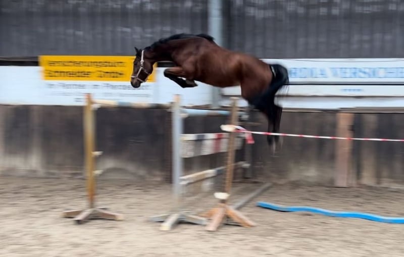 Self-reared and raised with us, this handsome gelding by Don Cor is now making his first jumps under the rider, impressively, with a lot of ability, caution, and very good technique. If you are interested, we look forward to your call at 0174/2020310.