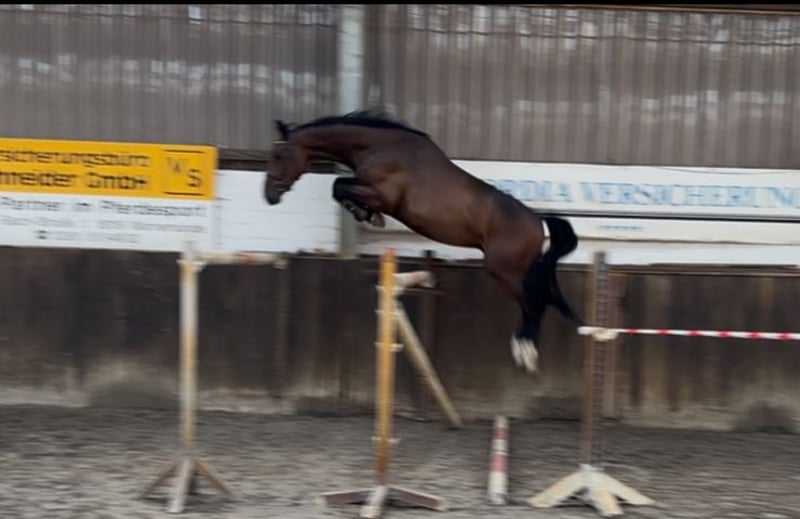 Selbstbezogen macht unser 4 jähriger Wallach von Empire seine ersten Sprünge unter dem Sattel. Er ist leichtrittig, lernt schnell, ist sehr gut im Umgang und hat einen tollen Sprungablauf mit Vorsicht bei viel Vermögen.