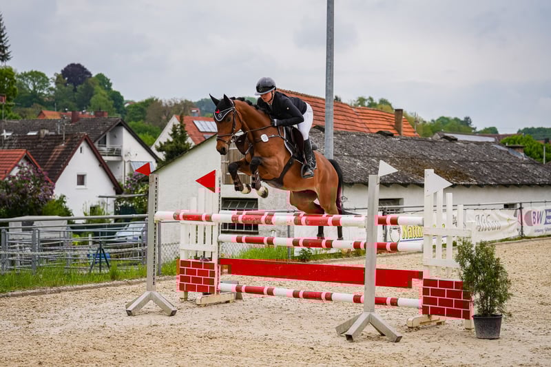 Na sprzedaż wystawiony jest 7-letni wałach od Casino Grande x Carnando. Casino de Luxe ma około 161 cm wzrostu i urodził się w kwietniu 2018 roku. Od 2022 roku jest w moim posiadaniu i został ze mną delikatnie wyprowadzony do jazdy. W wieku czterech lat miał okazję startować w konkursach skoków na poziomie 80 cm i z powodzeniem je pokonał. W 2023 roku odniósł szereg zwycięstw i miejsc na podium w konkursach skoków dla młodych koni kategorii A* i A**. W swoim pierwszym konkursie dla młodych koni w skokach kategorii L był od razu bezbłędny i uplasował się na miejscach. Jest wielokrotnie zwycięski i plasuje się na wysokich pozycjach w skokach kategorii A*/A** i L. W swoim pierwszym konkursie kategorii M również od razu pokonał trasę bezbłędnie. Dzięki dużemu i równemu galopu prezentuje zawsze harmonijny wygląd. Przy skoku jest bardzo ostrożny, ale jednocześnie odważny i zawsze pokonuje przeszkody. Również w terenie jest spokojny, niezależnie od tego, czy jeździ samotnie, czy w grupie. Jest również spokojny u kowala, zna załadunek na przyczepę, ciężarówkę i dwupokładowy transport. Casino de Luxe oddawany jest wyłącznie w najlepsze ręce. Zawsze chętny do pracy i chce zrobić wszystko jak najlepiej. Ze względu na moją operację ostatni raz startował na turnieju pod koniec maja 2025 roku. W tym czasie był normalnie jeżdżony i trenowany. Chętnie prześlę dodatkowe filmy na życzenie.