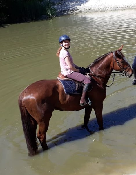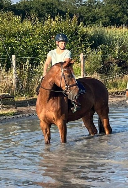 Donnie is a horse who enjoys every kind of fun, whether hacking, competing in show jumping, participating in ring-stechen, or riding through water – he always handles everything perfectly. He has placements in A** show jumping and jumping classes with potential for even more. Due to a handicap, he is being offered at a significantly reduced price. He is blind in one eye, but this does not noticeably affect him when riding or handling. We bred Donnie ourselves and are giving him up with a heavy heart because we lack the time, and he is far too good to be left standing around. More information gladly by phone.