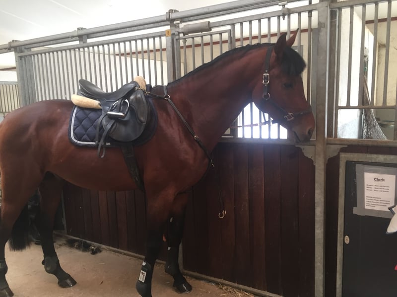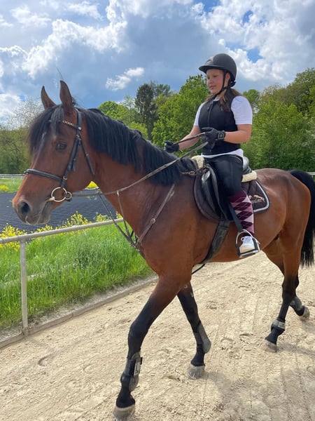 I have had Leon for 10 years. He has never exhibited stallion behavior, often stands beside mares or goes out riding with them. He has never been ill. At age 6, he sustained a kick injury in the pasture, which caused chips to form. These were completely removed through surgery. Since then, he has been regularly ridden for leisure. A few weeks ago, he competed in a beginner-level dressage and a beginner-level jumping class with a novice rider, and he placed in both! He really enjoys going out on rides. Generally, he is a rather relaxed and easygoing companion. Therefore, he is very well suited for a nervous rider or a beginner. He is very friendly, very handsome, well-behaved in handling, shoeing, and loading, and one of his favorite activities is definitely munching on lots of hay 😄 Space is more important than price.