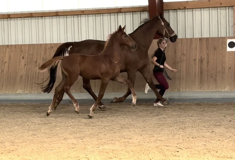 Direct van de fokker: Zeer lichtvoetige rubberbal met alle mogelijkheden!! Wij bieden een correct gebouwd, slank hengstveulen met voldoende bloedafkomst van de nieuwe opkomende ster Dorian Grey uit de Nijhof-stal (afstammend van Dominator Z). De moeder heeft zelf op jonge leeftijd in de sport gelopen en was tot en met M niveau in de springcompetitie geplaatst (vermogen grenzeloos). Ze viel al op door haar zeer goede berijdbaarheid en bewegingen, die ze ook aan haar nageslacht heeft kunnen doorgeven: Zeker ook interessant voor dressuur- of eventingruiters, het hengstveulen beweegt zich in alle gangen zeer goed!!!!