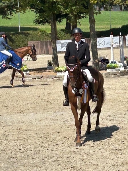 A la venta nuestra apreciada y talentosa yegua Angela. Angela ha competido con éxito en salto deportivo hasta la categoría de Gran Premio (S, 1,40 m)*. Solo en este año, ha logrado colocarse varias veces en concursos de salto de las categorías M a S, además de obtener varias victorias. Se destaca por su gran ambición, una excelente actitud hacia el salto y su agradable disposición, con un buen impulso y un hermoso arco en el salto. La vemos ideal para un jinete junior talentoso que desee progresar paso a paso en el mundo del salto con un caballo con mucha potencia y ganas de aprender. Bajo la silla, se muestra sensible a las ayudas y siempre intenta agradar. En tierra, es muy tranquila, se maneja sin problemas y, por supuesto, es tranquila en la ferrería y en el transporte. Quien busque un caballo de salto ambicioso, con mucho corazón, actitud y coraje, ha llegado al lugar correcto. No dude en contactarnos por teléfono. La yegua solo se vende porque el propietario desea reducir su caballada. Actualmente no dispone de un certificado de salud actualizado, pero puede realizarse a petición del comprador.