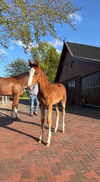 For sale is a filly, born at the end of February 2025. The foal is typy, correct, and very growthy; her colorful chestnut color also makes her visually something very special. She moves freely through her body and already shows a powerful uphill canter. The sire, Capital One, has been very successful in show jumping competitions and qualified for the Bundeschampionat last year. His first crop of foals impressed with type, size, and movement quality. The dam competed in sports before her breeding career and was successful up to show jumping classes of level M. A full sister of the dam has placed up to S level. The Oldenburg maternal line of Kundi boasts a variety of sport horses and licensed stallions from direct relatives and is known for its durability and willingness to perform. Anyone looking for a future gem for breeding and sport will find it here. If you are interested or need further information, please feel free to contact me.