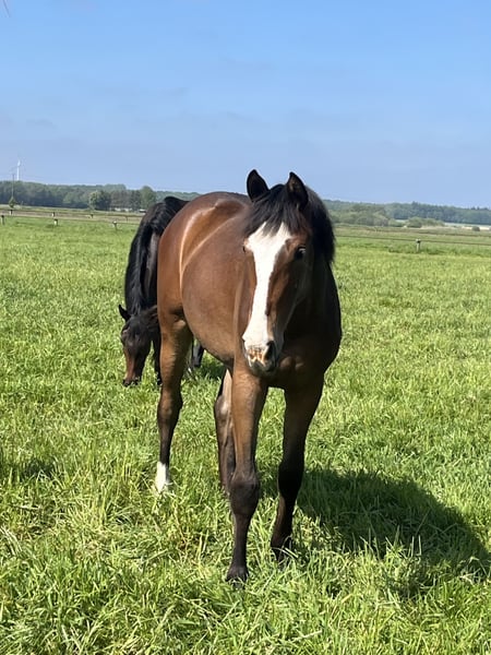 Zum Verkauf steht diese 3 jährige braune Stute abstammend von Asterix de Couleur x Blockbuster x Quintender x Escudo Behutsam auf der Wiese in einer großen Stutenherde aufgewachsen und noch sehr roh. Aufgrund von Zeitmangel abzugeben.