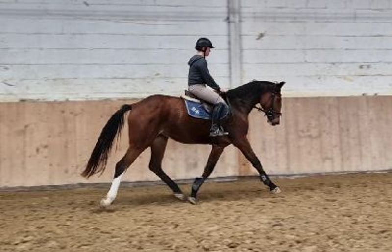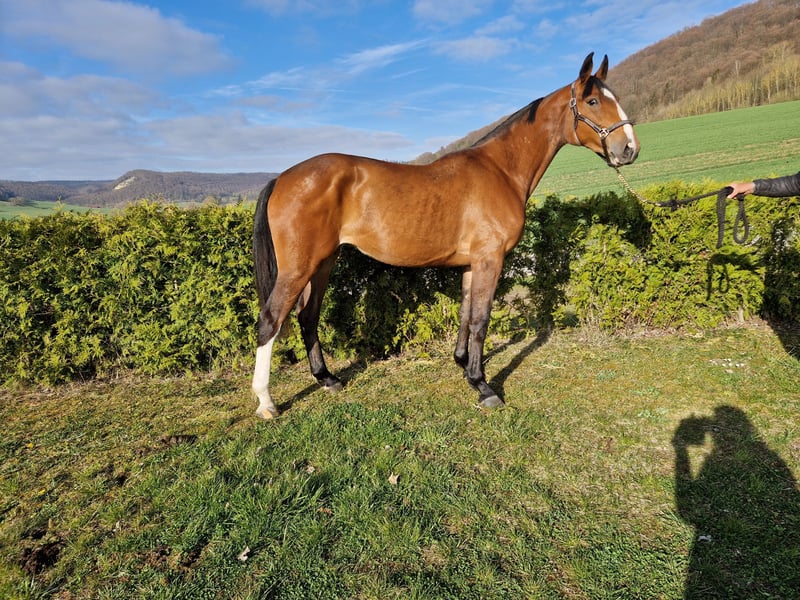 For health reasons, a 3-year-old mare by Casallco out of a Balou du Rouet mare is for sale. She currently measures 16.1 hh. She has been backed and shows good riding qualities, is very eager to learn, and behaves well. In free jumping, she demonstrates excellent technique, is cautious, and has good scope. Vet check completed with no findings. Additional videos or information are available by phone or WhatsApp at 0170 4118 761. The mare's dam (currently in foal to Meganus PS) and other young horses are also for sale.