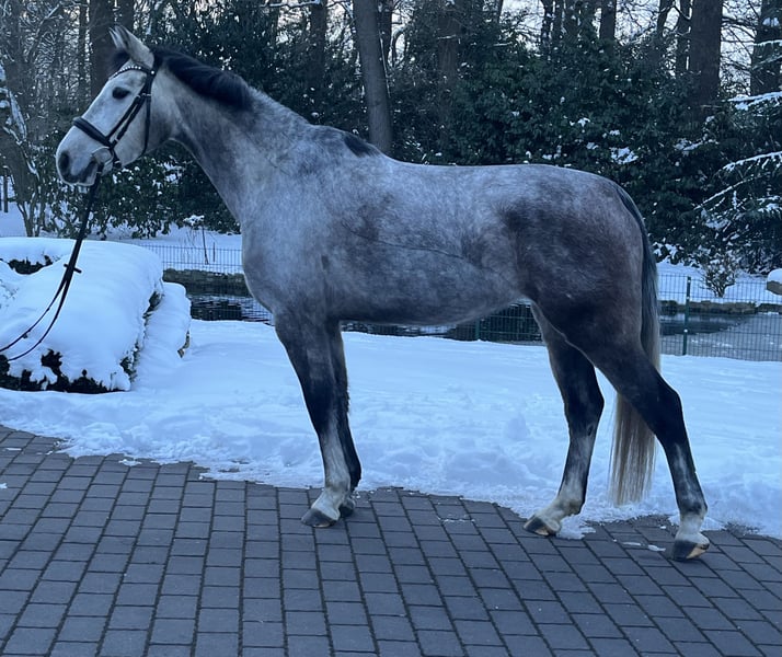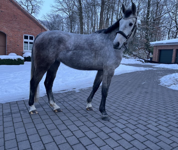 Ich verkaufe hier meine 5-jährige Oldenburger Stute. Sie ist am 09.04.2021 geboren, aktuell 1,63m groß und stammt ab von Cornet's Darco x Toulouse x Clinton II x Balou du Rouet. Züchterin ist meine Schwester; sie war also bisher immer im Familienbesitz, wurde 3-jährig schonend angeritten und dann nach einer Pause in Ruhe weiter von uns ausgebildet. Sie liebt es zu springen und macht das sowohl beim Freispringen als auch unter dem Sattel hervorragend, auch wenn sie bisher eher wenig gesprungen wurde, weil ich einfach keine Springreiterin bin. Da sie aber jede Menge Vermögen, das nötige Go und eine super Einstellung hat, könnte man mit ihr mit ein bisschen Training direkt die ersten Turniere gehen. Sie will immer auf die andere Seite und springt routiniert alles, ohne, dass man ihr einen der Sprünge vorher zeigen müsste. Ihr einziges Manko: Sie hat sich leider bei mir in den letzten Monaten angewöhnt, zwischendurch beim Reiten mit dem Kopf zu schütteln (kein Headshaking). Manchmal nur ganz minimal und manchmal sehr stark, vor allem, wenn sie merkt, dass es funktioniert und ich absteige. Da ich ein eher ängstlicher Reiter bin, hat das blöderweise ziemlich gut geklappt und sie probiert es jetzt bei mir oder bei neuen/unsicheren Reitern öfter mal aus. Meine Schwester reitet sie aktuell auch noch mit und reitet dann darüber hinweg; dann hört sie nach ein paar Minuten auf und man kann wieder ganz normal weiter reiten. Bei ihr hat sie es zwischendurch auch schon wochenlang gar nicht mehr gemacht, deshalb gehen wir davon aus, dass ein erfahrener Reiter, der sich nicht einschüchtern lässt, das Problem auch ganz weg bekommen kann. Tierärztlich und osteopathisch konnte nichts festgestellt werden und unsere Osteopathin (die auch Tierärztin ist) geht auch davon aus, dass es eine schlechte Angewohnheit ist. Gute Röntgenbildern liegen vor und krank oder verletzt war sie auch in ihrem ganzen Leben noch nicht. Ansonsten ist sie im Umgang sehr brav und auch beim Reiten ein tolles Pferd: nie schreckhaft oder guckig, sehr menschenbezogen und liebt es, gelobt zu werden. Mit Sicherheit kann Sie auf Dauer auch ein tolles Junioren-/Umsteigerpferd werden, aktuell benötigt sie aber einen erfahrenen Reiter aufgrund der vorhandenen Problematik. Videos sind auch vorhanden und können auf Wunsch gerne verschickt werden.