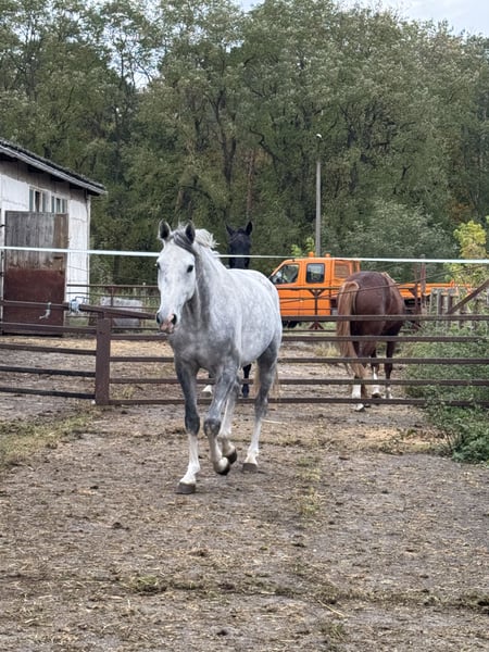 Verkauft wird diese fünfjährige Schimmelstute von Diaron x Cornet‘s Stern. Sie ist ein sehr lernwilliges Pferd mit viel Vermögen und Vorsicht am Sprung.