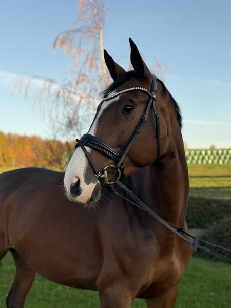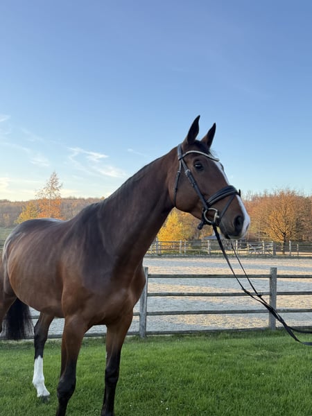 This four-year-old bay mare impresses with her balanced temperament, rideability, and promising talent. She consistently behaves well, is uncomplicated, and friendly in handling—whether during grooming or farrier visits. She remains calm and fearless in the field as well. In the show jumping arena, she demonstrates good overview, sufficient caution, and remarkable jumping power. Her initial placements in A-level show jumping competitions confirm her ability and potential for further success in sport. Thanks to her honest nature and pleasant rideability, she is also well-suited for amateurs. A young mare with a bright future and character, she brings joy every day.